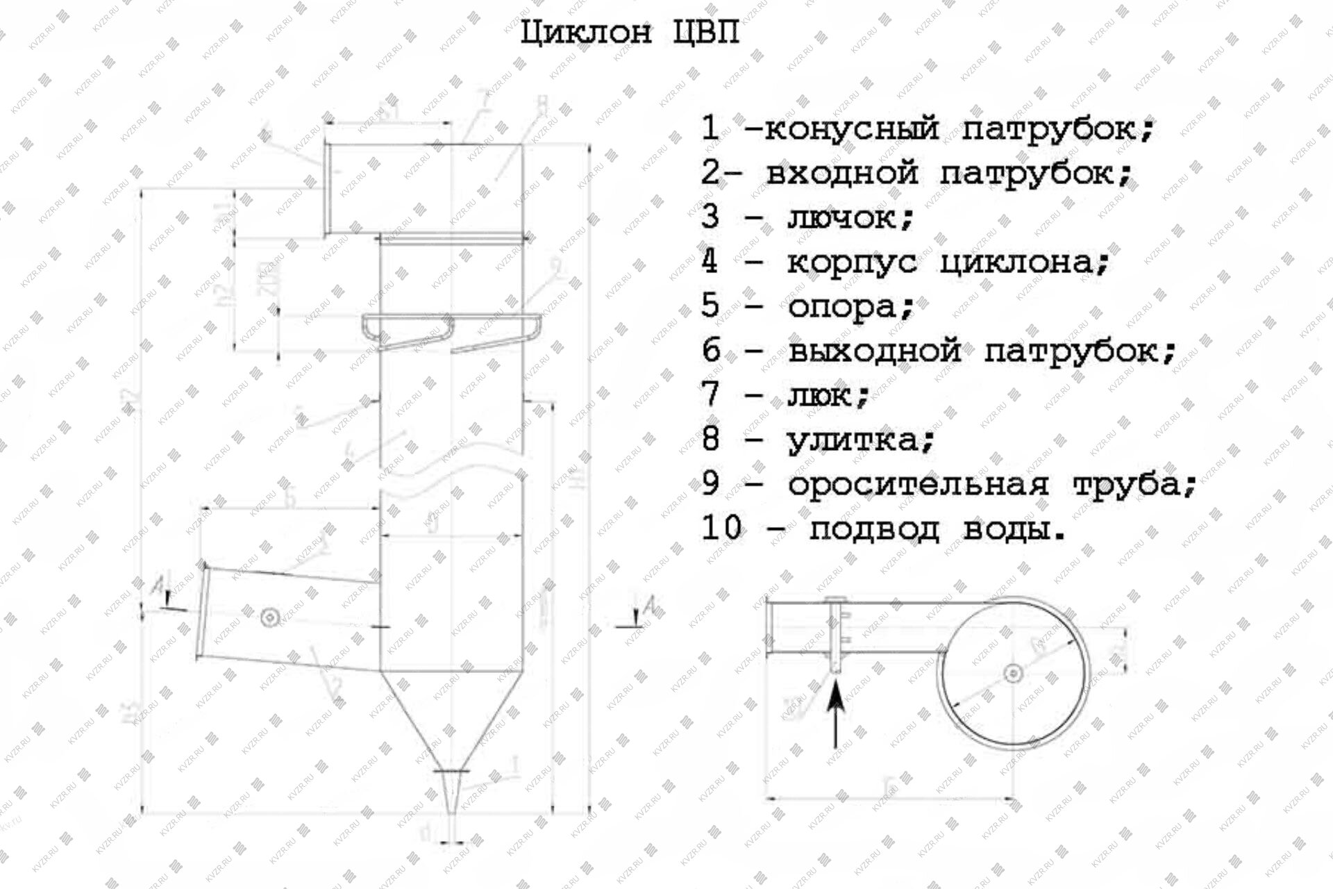 Циклон ЦВП состоит из корпуса с воздухоподводящим патрубком и воздухоотводящей улитки, присоединенной к верхнему фланцу корпуса. Воздухоотводящий патрубок улитки может быть установлен в любых различных направлениях по отношению к воздухоподводящему патрубку. Направление воздухоотводящего патрубка можно изменять на углы, кратные углу между двумя смежными болтами. К нижней части корпуса приварен прямоугольный фланец, к которому при помощи петли и откидного бола с барашком прикреплен шламоотводящий конус. Конус, при заполнении его шламом, образует гидравлический затвор. Вода для орошения внутренней поверхности корпуса по давлению 0,02 – 0,025 МПа (0,2 – 0,25 кгс/см2) подается соплом по резиновым трубкам, присоединенным к кольцевому коллектору. Для наблюдения за работой сопла в верхнем днище улитки имеется люк, закрытый застекленной крышкой. В воздухоподводящем патрубке предусмотрено смывное устройство для удаления отложений шлама в месте входа воздуха в корпус аппарата.